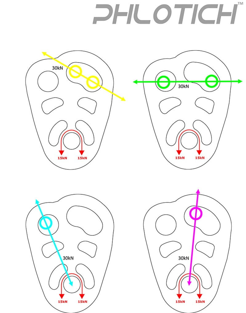 - przy wspinaczce na podwójnej linie, Phlotich pozwala na efektywne wyrównanie dwóch kotwiczących karabińczyków na jednym kole, zamiast rozdzielania na dwie oddzielne kotwice,