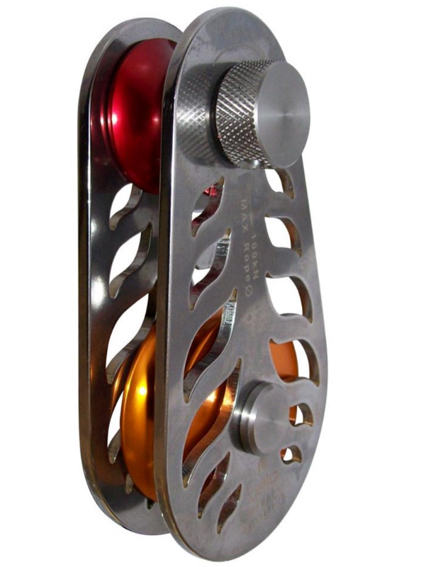 - Na szczycie bloku producent zainstalował trzpień o podwyższonej wytrzymałości, zdolny do obsługi zarówno statycznych, jak i dynamicznych obciążeń. Osadzona na nim rolka może przyjąć stanowiska lub pętle riggingowe o średnicy do 25 mm.