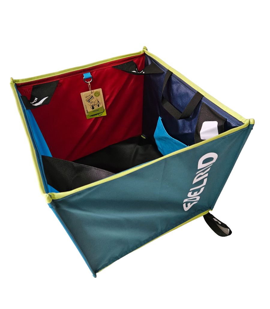 CRAWLER 2R to kompaktowy, składany kosz, który po złożeniu zajmuje minimalną ilość miejsca i może zostać zabezpieczony bocznymi pętlami. Wystarczy jeden prosty ruch (skręcenie), aby samonośna konstrukcja była natychmiast gotowa do użycia.