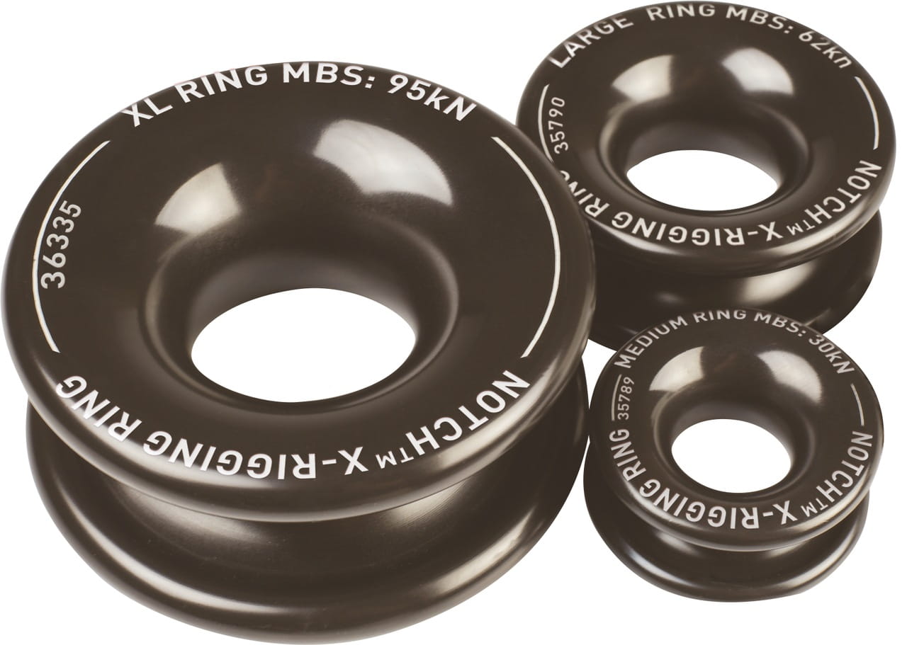 - Pierścień w rozmiarze XL: wewnętrzna średnica 38 mm, średnica liny do 28 mm, siła niszcząca: 98 kN.
