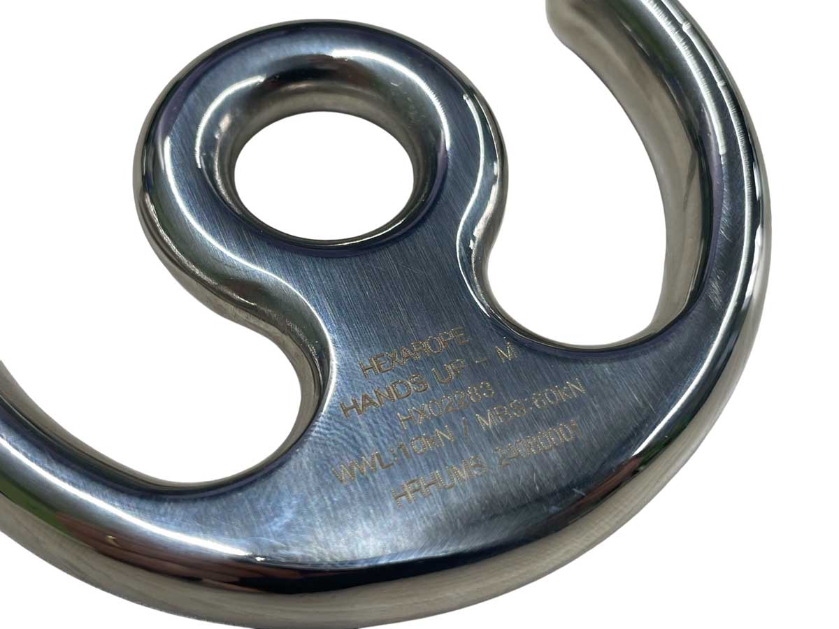 W zależności od wybranego wariantu, HANDS UP może być instalowany na linach o średnicy od 9 do 12 mm (rozmiar S), 12 do 16 mm (rozmiar M) oraz 16 do 20 mm (rozmiar L). W każdym wypadku podane wartości oznaczają, że lina będzie pewnie siedziała nie tylko na ramionach przyrządu, ale i w centralnym oku. Naturalnie, krawędzie przyrządu zostały maksymalnie wyoblone dla bezpiecznej współpracy z tekstyliami. - HANDS UP został wykonany w 100% z wysokogatunkowej stali, która zapewnia mu bardzo dobre parametry wytrzymałościowe, zarówno jeśli chodzi o dopuszczalne obciążenie robocze (WLL), jak i obciążenie niszczące (MBS). To pierwsze, w zależności od rozmiaru, wynosi 6.5 kN (rozmiar S), 10 kN (rozmiar M) oraz 16 kN (rozmiar L). Dla tych samych wariantów MBS wynosi odpowiednio 39 kN, 60 kN oraz 96 kN w przypadku największego wariantu. Wartości te udało się uzyskać zachowując jednocześnie kompaktowe wymiary oraz racjonalną wagę przyrządu.