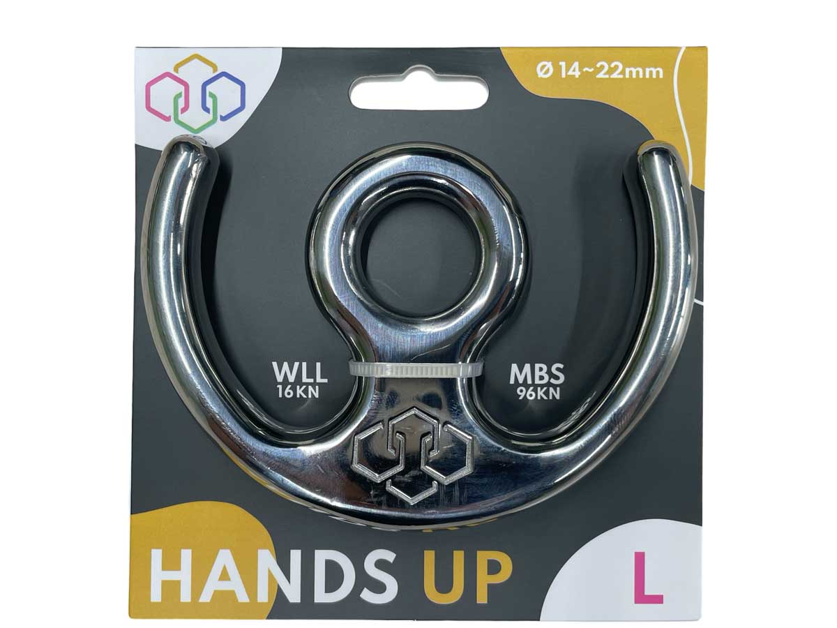 - HANDS UP oferowany jest w trzech rozmiarach: S, M oraz L. Różnią się one wytrzymałością oraz obsługiwaną średnicą lin, a także wymiarami. Dzięki temu użytkownik zawsze jest w stanie wybrać wariant odpowiedni do aktualnie realizowanego projektu. Należy przy tym pamiętać o kompatybilności innych elementów systemu riggingowego.