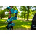 - Osiągnięcie tak wysokiego poziomu zaawansowania konstrukcji wymagało użycia materiałów najwyższej jakości. Korpus przyrządu to w 100% aluminium, anodyzowane na atrakcyjny, morski kolor. Uzupełniają je osie i trzpienie blokujące wykonane ze stali nierdzewnej. Użycie tych materiałów gwarantuje wysoką wytrzymałość i trwałość, a zarazem pozwala uzyskać niską wagę przyrządu (450 g). Oczywiście, wszystkie krawędzie przyrządu zostały maksymalnie wyoblone dla zapewnienia maksymalnego bezpieczeństwa delikatnych włókien liny.