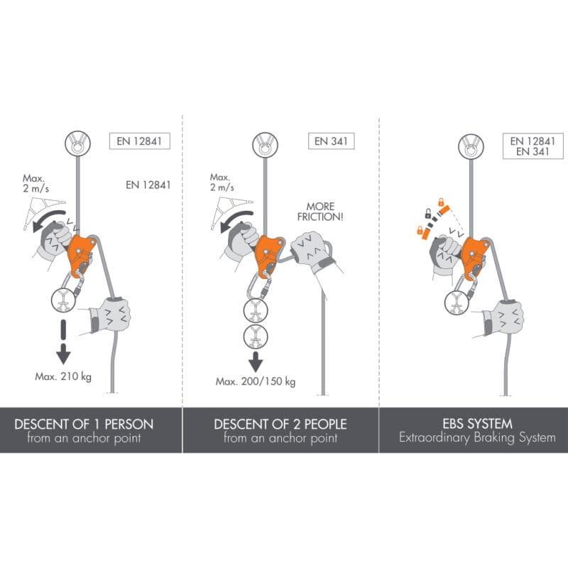 Samoblokujący przyrząd zjazdowy do prac linowych z dużym obciążeniem. Umożliwia operatorowi opuszczanie się na linie roboczej, pozycjonowanie się na linie roboczej i wchodzenie po tej samej linie. Jest idealny w przypadku wspomaganego opuszczania dwóch osób z urządzeniem zainstalowanym na kotwicy (operator opuszcza ratownika i osobę ratowaną) lub do jednoczesnego opuszczania dwóch osób (ratownik opuszcza się wraz z osobą poszkodowaną).