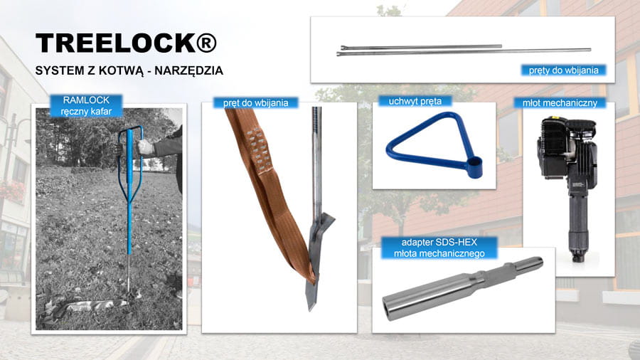 Treelock firmy GEFA to innowacyjny system podziemnego mocowania bryły korzeniowej, przy wykorzystaniu pasów mocujących wyposażonych w kotwy i pasa ściągającego wraz z napinaczem zapadkowym.