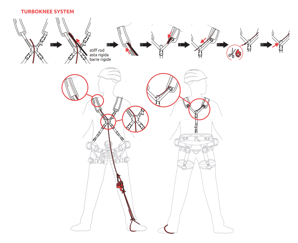 Dedykowane punkty mocowania dla systemu Turboknee. Uprząż przeznaczona jest do zwiększenia komfortu podczas pracy w uprzęży arborystycznej. Pomaga w korzystnym dla pracownika rozłożeniu ciężaru ciała.